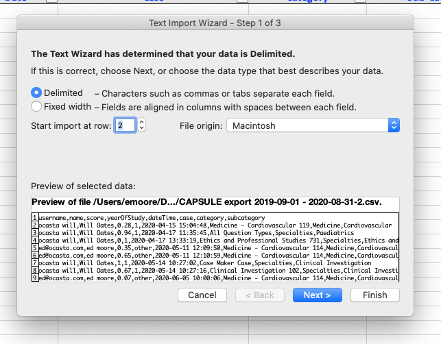 5. Check Delimited is selected and change ’Start Import at row’ to be [2], then press Next.