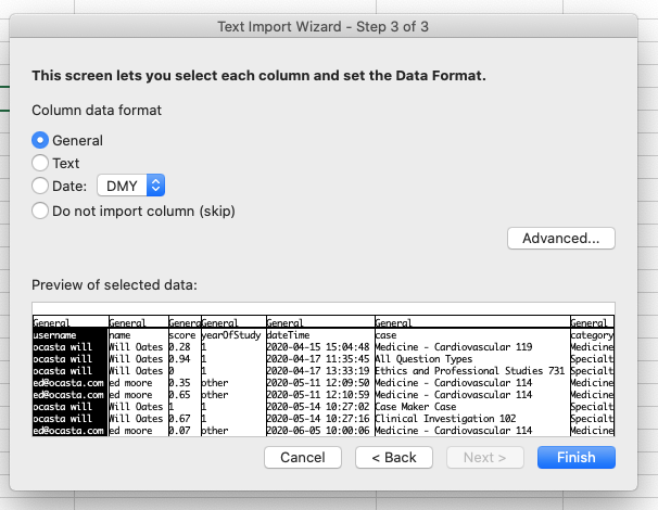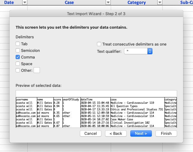 The import is now complete. Using the column header drop down options you can now filter on any particular area of the case history you are interested in. This may be a particular student, a Specialty, a cohort or a Score threshold.(or a combination of many filters)