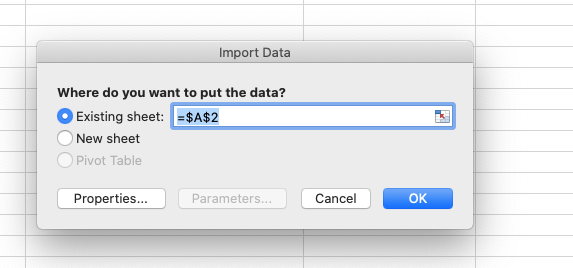 8. As a final check make sure you are importing to cell A2 and hit OK.
